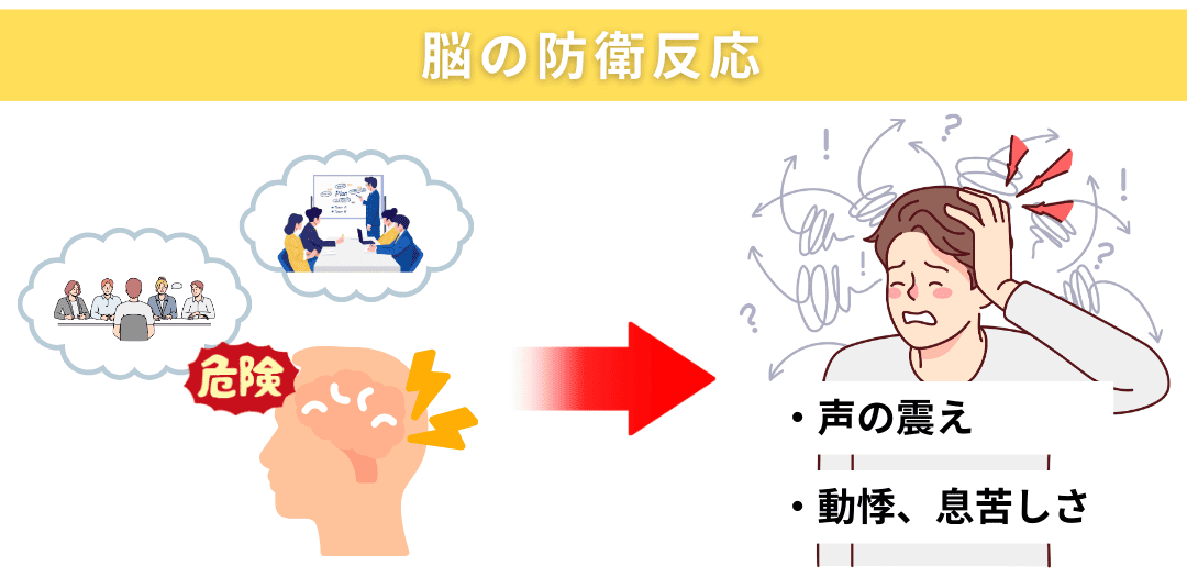 本来は危険から身を守るための仕組みですが、緊張する場面で脳が「危険だ!」と勘違いしてしまうことで、声の震えや動悸など、さまざまな体の反応が現れてしまうのです。