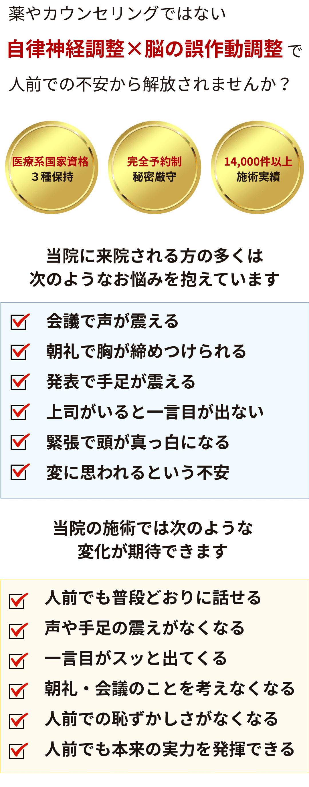 A. プレゼンや会議で緊張する会社員、受験や就活で不安を抱える学生、接客業や歌手、声優、スポーツなどで人前に立つ方など、幅広い方が来院されています。